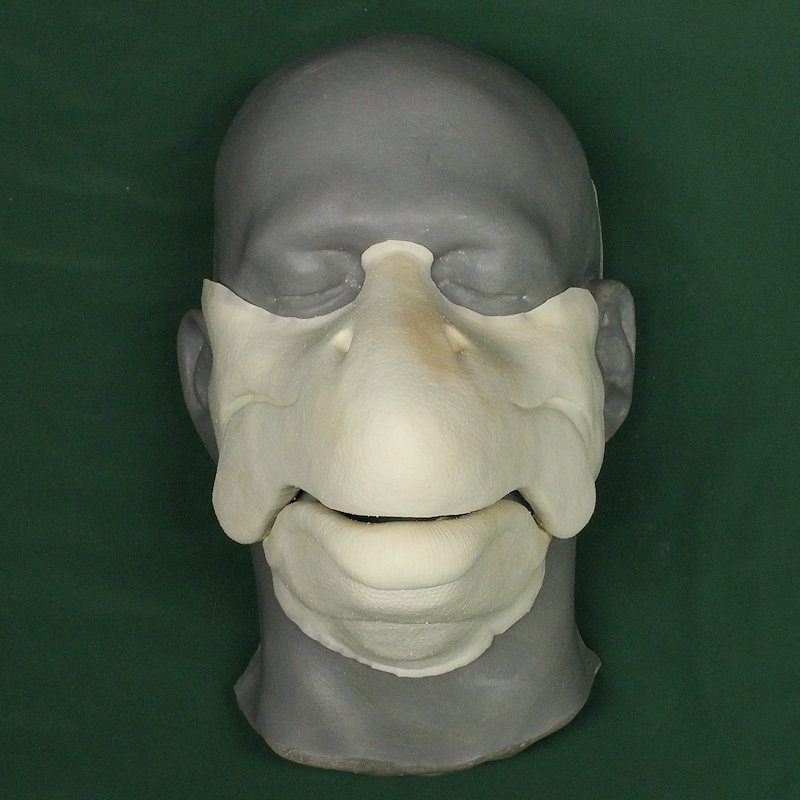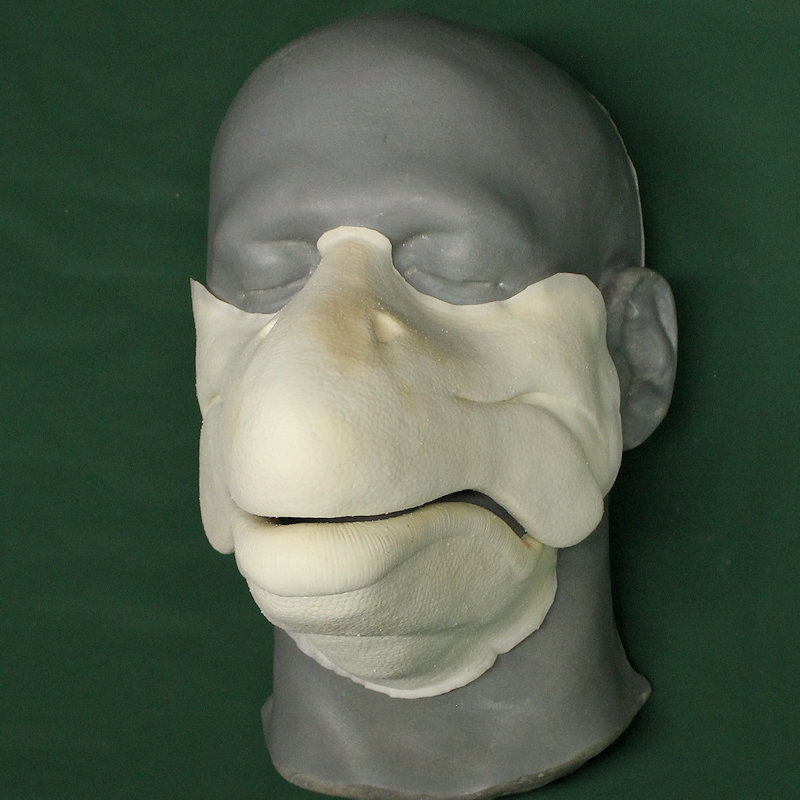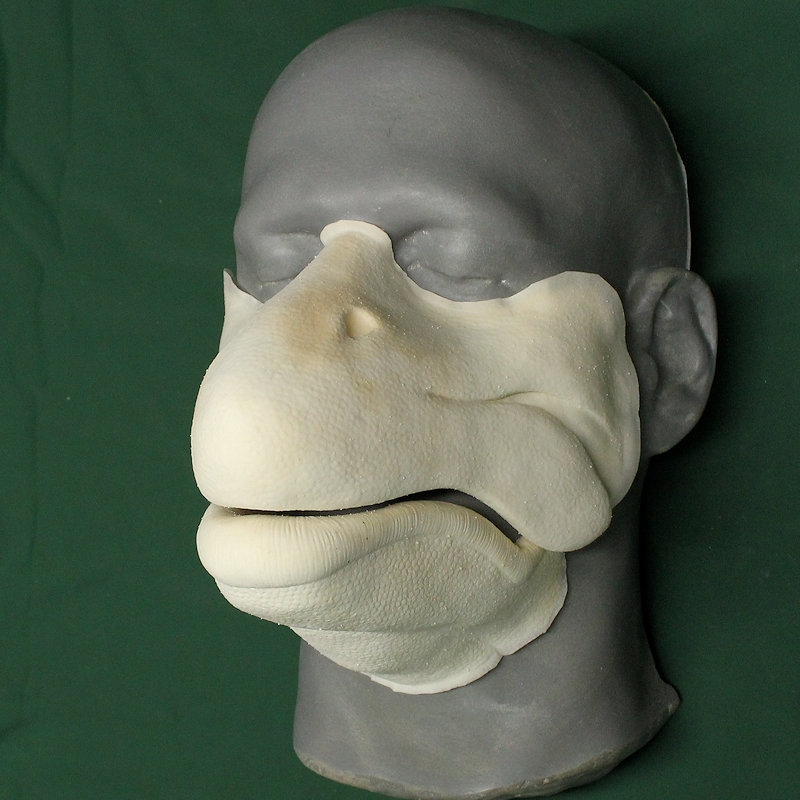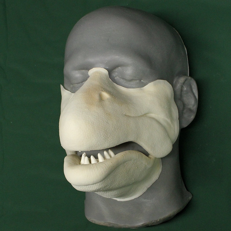 This is our Salmon Muzzle. Like most of our pieces, this prosthetic appliance was made to fit most faces. The main picture is the hot foam latex version applied and painted with PAX paint.