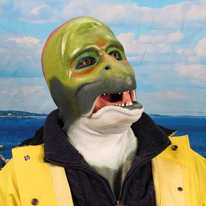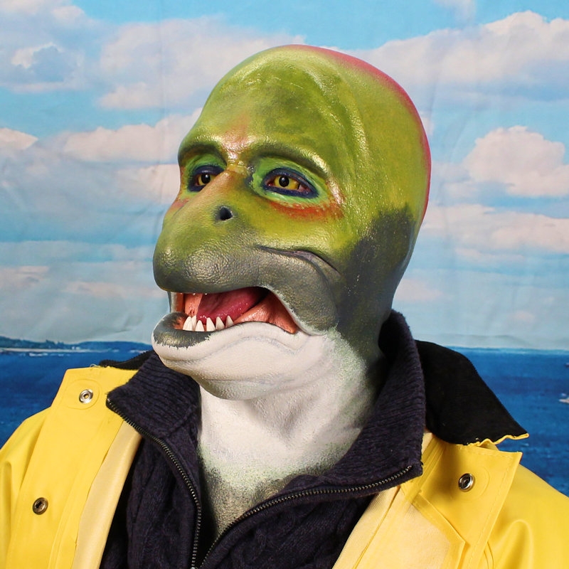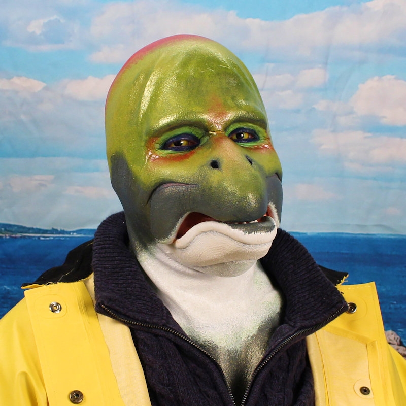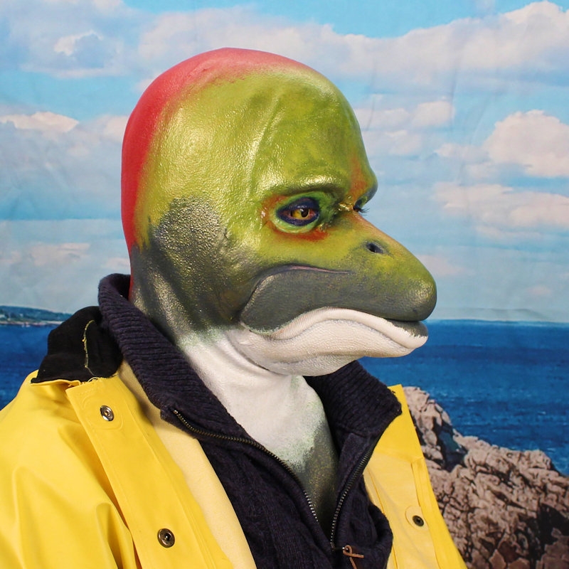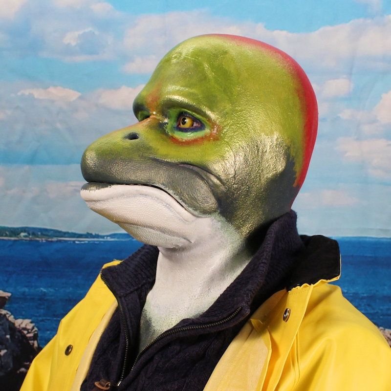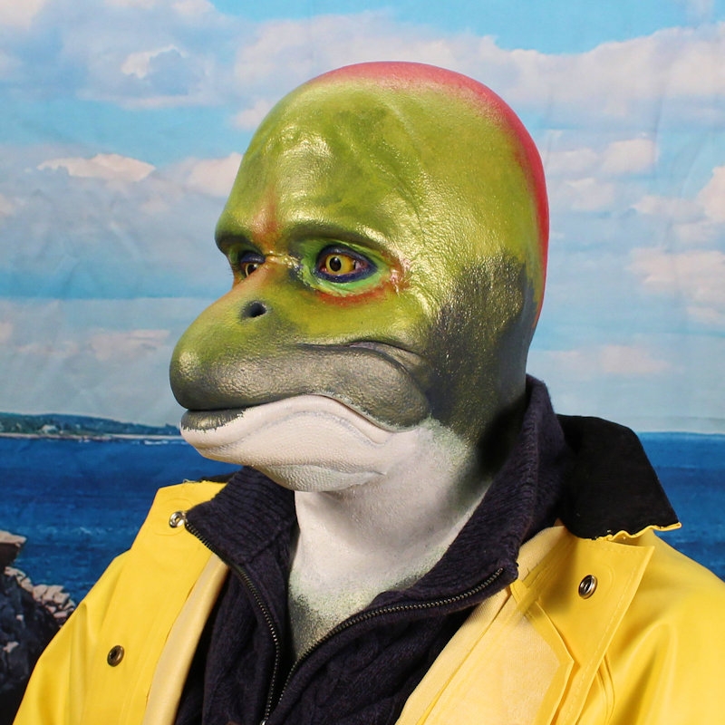 Salmon Muzzle foam latex prosthetic is applied and painted as a sockeye salmon with Neutral Brow and a latex hood.